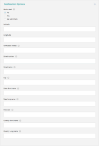 | Geolocated | Flag indicating whether the address should be geotagged with the Google Maps API Geocoding |
